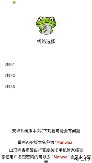 1、在本页面找到漫蛙manwa软件,下载安装后打开,首先选择要进入的线路