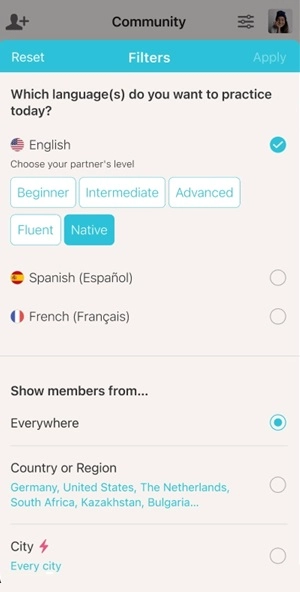 2. 审核通过后,进入语言交换社群,你还可以根据语言、地点、兴趣等条件进行搜索,找到合适的语言交换伙伴。