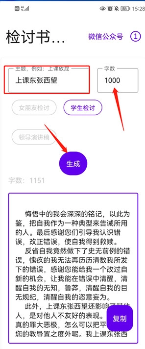 用户可以通过关键词描述主题,获取更细腻的检讨书,无论字数是三百字还是数千字都能生成,不仅能得到原创作品,还支持文案的自动保存。
