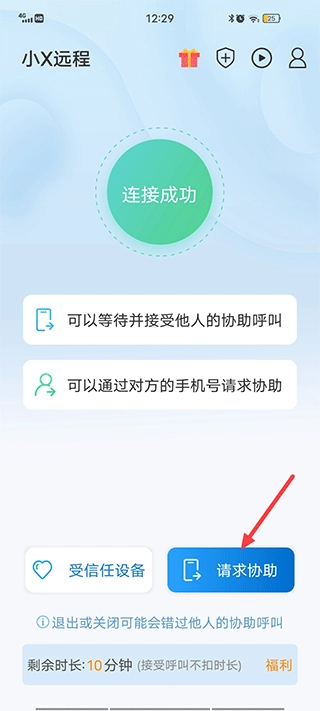 1、打开小X远程并完成登录操作,接着点击首页上的“请求协助”按钮。