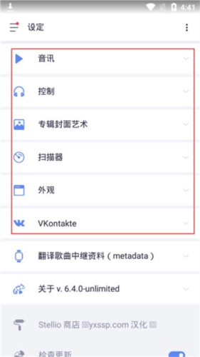 4、在“设定”里能够对音讯、控制、专辑封面艺术、扫描器、外观等项目进行设置;