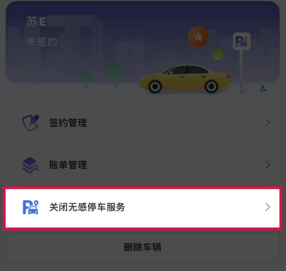 步骤二:挑选要操作的车牌号,进入车辆详情页面,点击“关闭无感停车服务”选项,完成关闭操作。