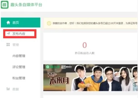 1、我们先打开软件,完成好趣头条的注册登录操作,进入趣头条主页后,再点击左侧菜单栏里的【发布内容】选项。