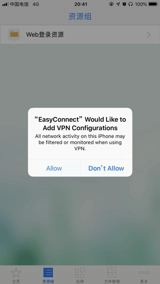 3、首次登录VPN时,可能会弹出如下英文提示,此时选择“Allow”即可。之后系统会自动跳转到网络连接请求界面,点击“确定”就能完成验证。
