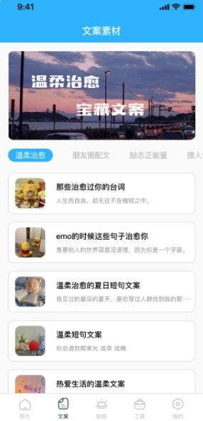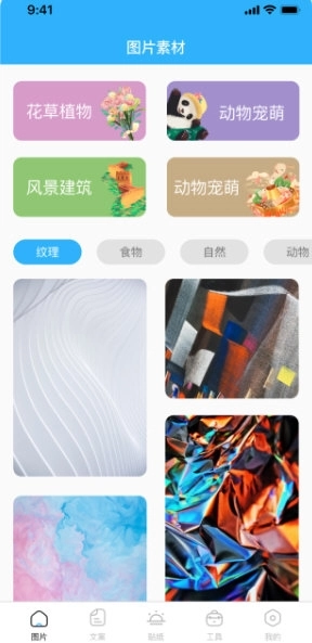软件内的图片素材与文案素材均有清晰分类,便于用户快速查找。