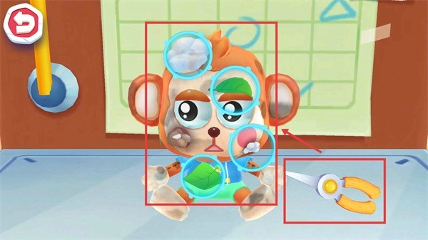 3、进入修理页面后,在右侧选择合适的工具(例如钳子),然后对玩偶身上对应的损坏部位(比如标注出的破损处)执行修理操作。