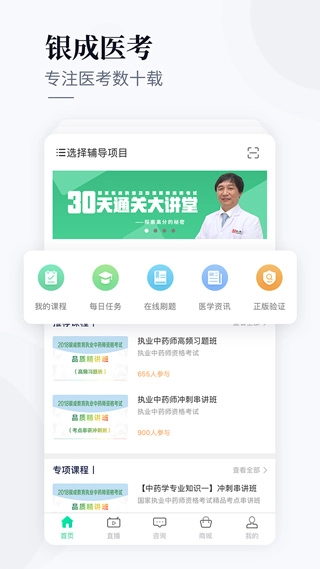 覆盖了医师考试培训领域的全部题库与视频资源,包含执业医师、助理医师、考研西医、西药师、中药师以及乡村全科六大类大纲内容。