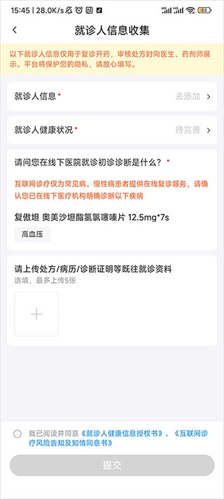 5、最后请上传处方、病历、诊断证明等既往就诊资料,然后点击提交,即可完成处方药的购买。