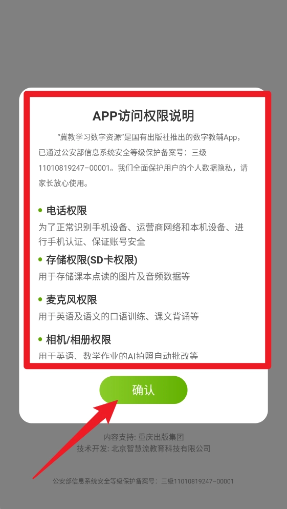 2、系统会弹出【访问权限说明】提示,其中涵盖电话、存储、麦克风及相机权限,为确保功能能够正常运行,请点击【确认】按钮。