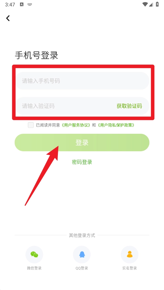 3、在登录界面输入号码并获取验证码,确认已阅读协议后点击【登录】按钮,就能快速完成账号的注册或登录操作。
