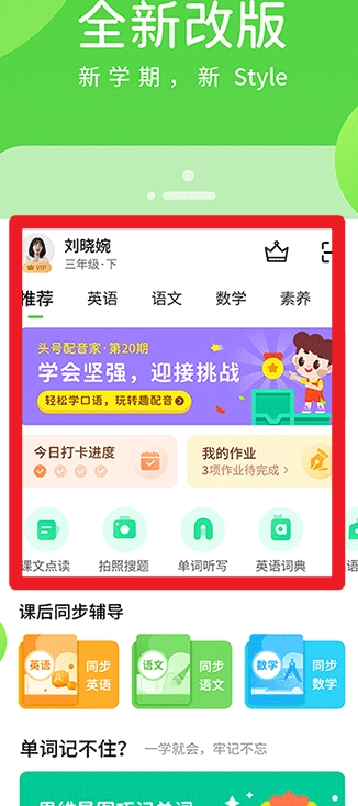 4、进入首页后,能够查看学习进度和作业完成情况,还提供课文点读、拍照搜题、单词听写、英语语音等多种学习功能。