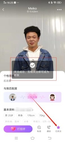 2、之后进入他的个人主页,找到页面右下角的“关注”按钮并点击,这样我们就完成了对他的关注操作;若希望成为好友,双方则需要进行互相关注。
