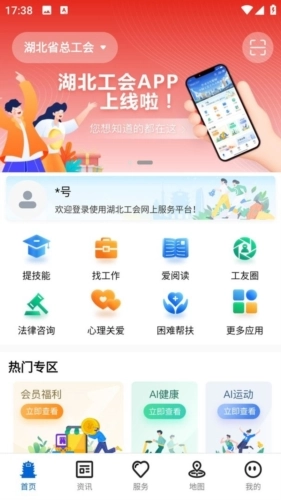 4、网络热点主题活动、省总工会及市总工会资讯、短视频浏览,12351服务、困难帮扶、心理疏导、法律援助,劳动模范相关政策咨询等。
