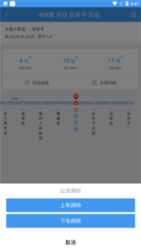 4、先点击你计划下车的站点,接着点击公交闹铃功能,就能完成下车闹铃的设置;当车辆抵达该站点时,系统会自动提醒你到站,这样就不用担心坐过站了。