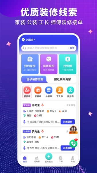 1、量房报价:平台入驻的装修服务人员能够迅速回应业主的需求,上门进行实地测量并提供详细的报价清单。