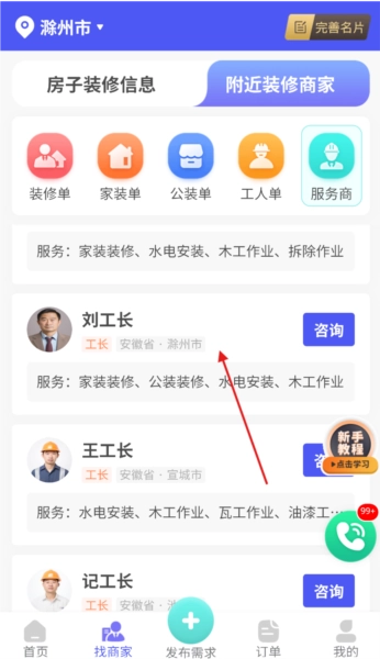 2、口碑导向展示:采用口碑排行的形式呈现周边装修公司、工长等服务方,助力优质资源凸显,减少业主的选择消耗。