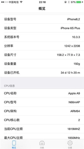 设备概述部分包含当前设备的系统版本号、设备类型、可用存储器容量、视网膜显示支持情况、MAC地址与IP地址。当设备未连接网络时,IP地址会显示为0.0.0.0。接下来是较为详尽的CPU信息——这在目前同类内容中并不常见,具体涵盖CPU类型、CPU架构(如ARMv7、ARMv7F等)、核心数量、字节序(通常为小端模式)、Cache行大小(不同设备可能为32字节或64字节)、L1指令Cache容量、L1数据Cache容量、L2 Cache容量、L3 Cache容量,以及CPU主频、总线频率,还有是否在用户模式下支持性能监视器。