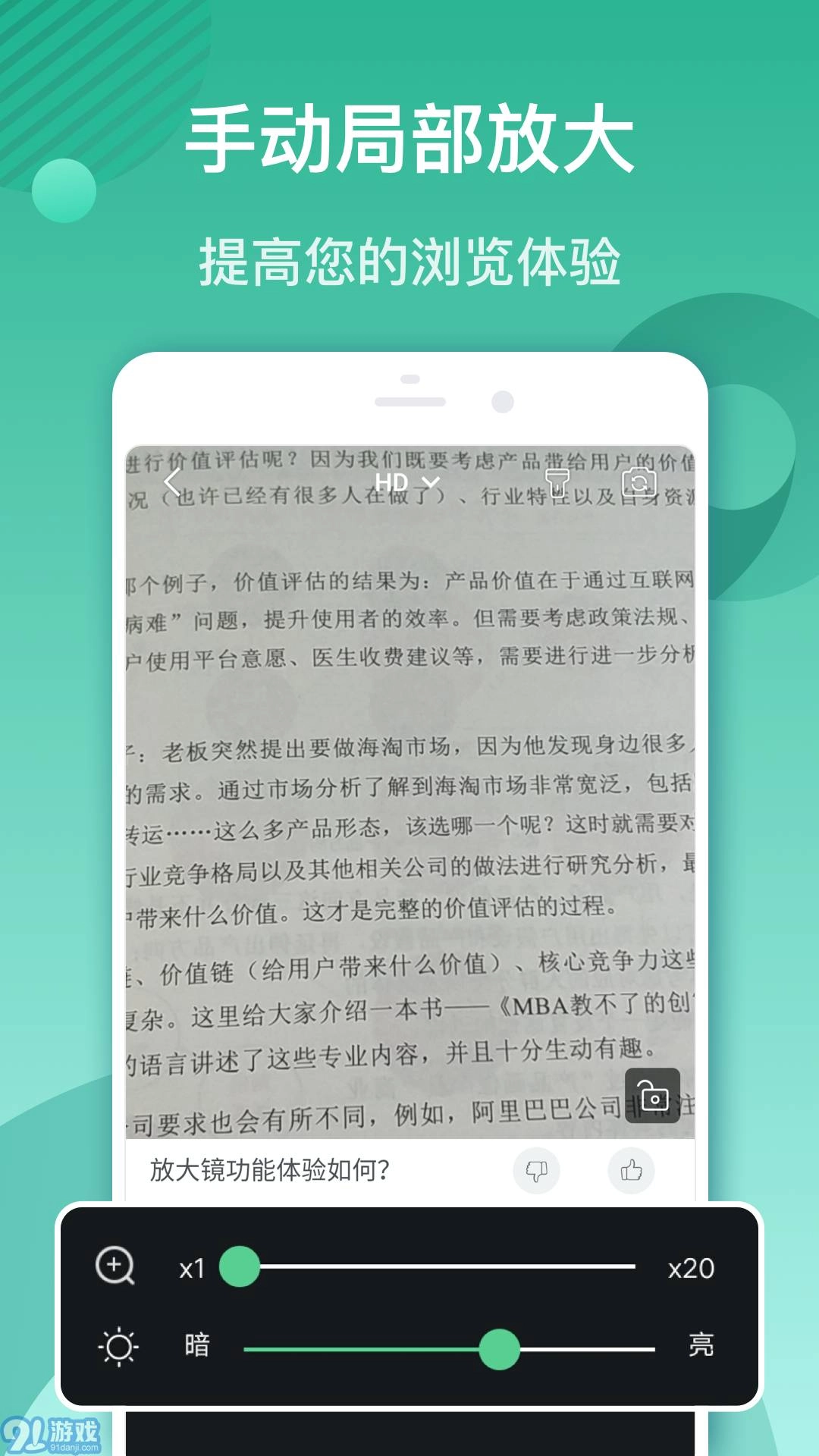 1.放大功能强劲:文字放大镜可实现1-20倍的放大效果,用户能依据自身需求拖动滑块调节缩放比例,便捷地放大文字或物体。