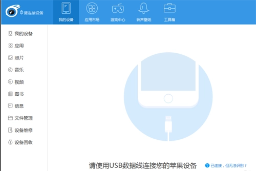 把苹果设备用数据线连接到个人电脑,并且打开iTools电脑客户端,让它自动识别设备。