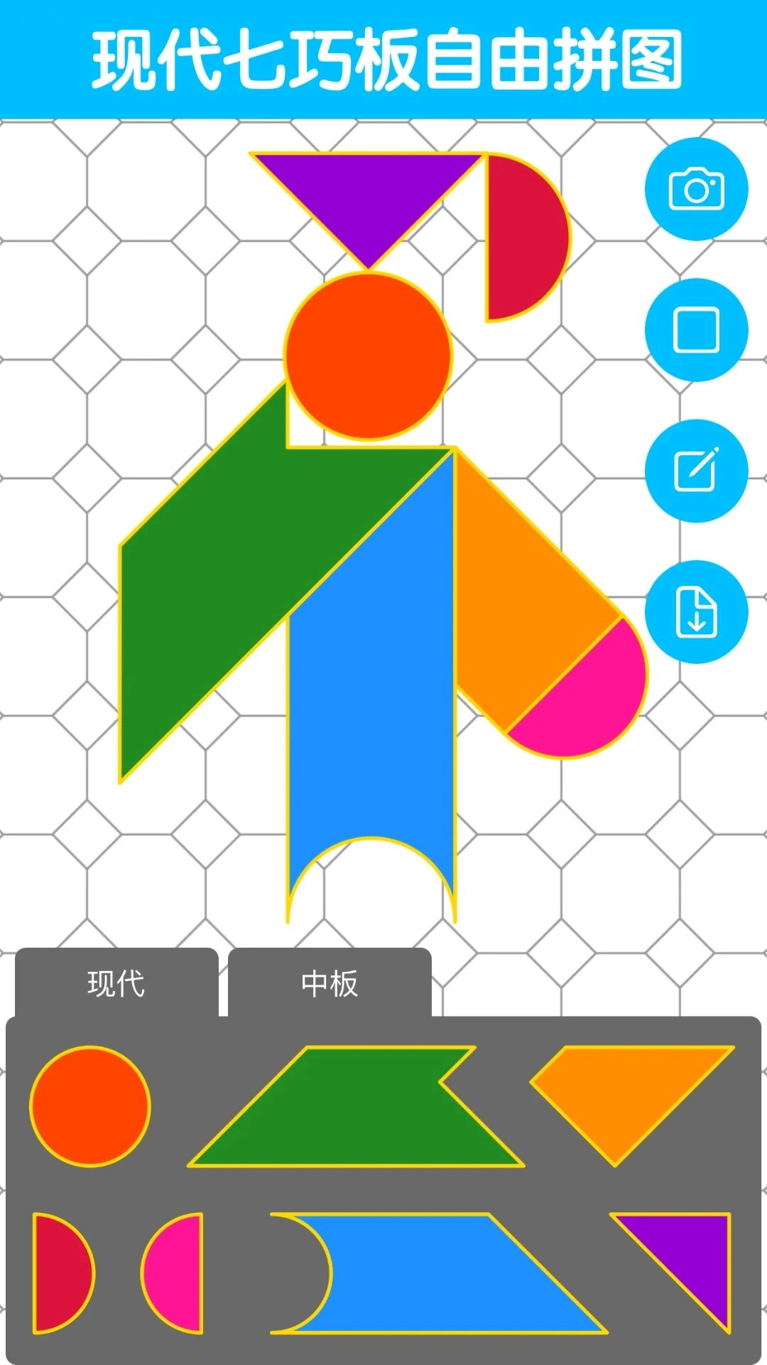 1.多类型七巧板支持:涵盖传统中国七巧板、日式七巧板、欧式七巧板与现代智力七巧板,用户能够自由切换不同风格的板块组合,挖掘多样化的拼图玩法。比如,日式七巧板更强调对称美学,现代智力七巧板则通过增加板块数量来提高拼图的复杂程度。