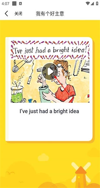 3、点击“我有个好主意”绘本进入学习页面,点击播放按钮,即可学习该绘本的英语表达,积累英语知识。