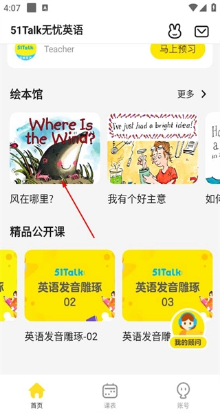 1、启动软件后,在首页的绘本馆板块中,有丰富多样的英语绘本可供挑选。当您点击《风在哪里》这类绘本时,即可进入相应的学习界面。