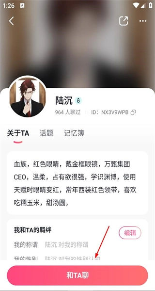 3、打开陆沉的角色界面,呈现他作为血族CEO的特质与喜好,点击界面底部的“和TA聊”按钮,即可开启与陆沉的对话。