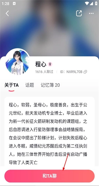 4、进入程心的角色界面,这里会呈现她的航天博士经历与性格特点,点击界面底部的“和TA聊”按钮,即可开启与程心的聊天对话。