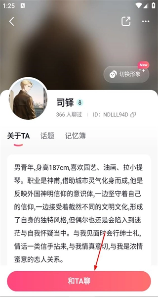 2、打开司铎的角色界面,能看到他的男神身高、兴趣爱好和职业信息,点击界面底部的“和TA聊”按钮,就能开启与司铎的聊天。