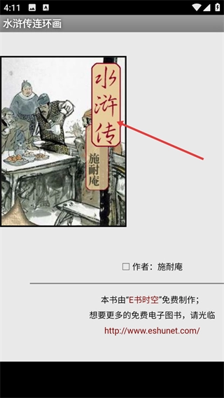 进入《水浒传连环画》电子读物后,能够查看书籍封面与作者信息,还能了解内容出品方以获取更多资源。
