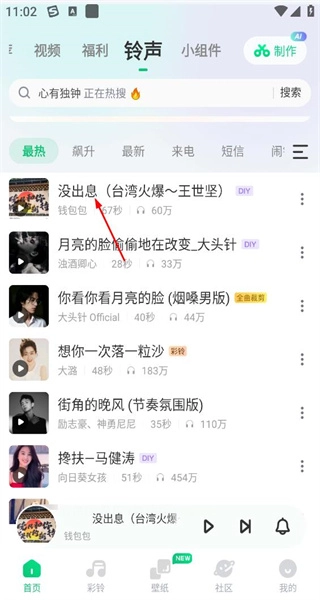 1、进入软件的铃声界面,找到“最热”分类下的铃声列表,从中选择“没出息”这一铃声,进入其播放详情页面。