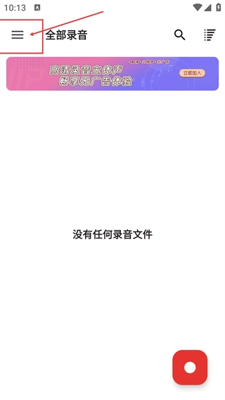 2、进入【全部录音】页面后,点击左上角的三条杠图标就能打开功能菜单;若当前没有录音文件,页面会显示相应的空状态提示。