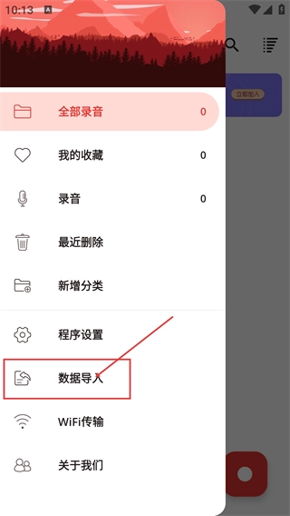 3、打开侧边功能菜单后,找到【数据导入】选项,借助此功能能够导入外部录音数据,菜单里还包含收藏、设置等功能。