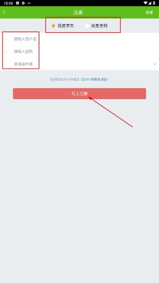 4、注册界面需先选择身份(例如【我是学生】),接着填写用户名、密码和号码,之后点击【马上注册】按钮,即可完成账号创建。