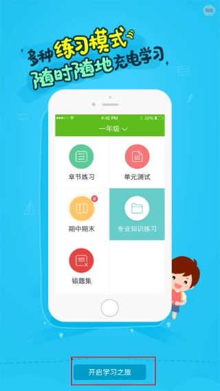 1、在233小学网校人教版应用的推广界面,点击【开启学习之旅】按钮,进入应用主功能界面后,就能选择多种练习模式。
