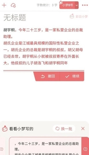 输入一段文字后,点击【AI小梦来帮写】,小梦会在一分钟内给出三条不同的故事走向。选择其中一条后,你可以修改续写内容,点击“继续”就能再次续写。如果对这三条故事走向都不满意,点击“换一批”,小梦就会重新生成新的故事走向。
