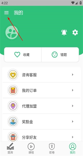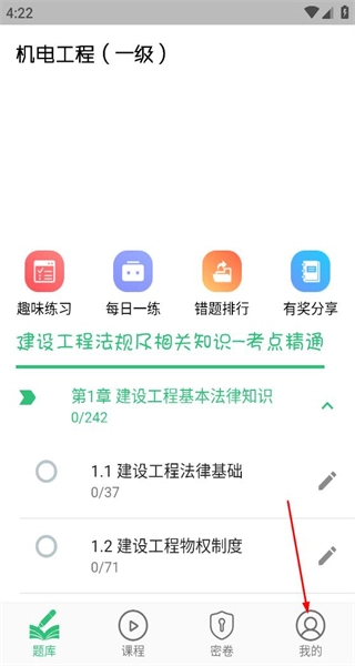 1、启动软件后,进入题库界面,找到底部导航栏最右侧的“我的”选项,点击该选项即可切换至个人中心页面。