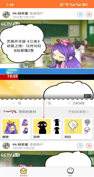4、完成注册与登录步骤后,进入创作界面,浏览动漫素材和作品案例,为挑选素材并开启动漫创作操作做准备。