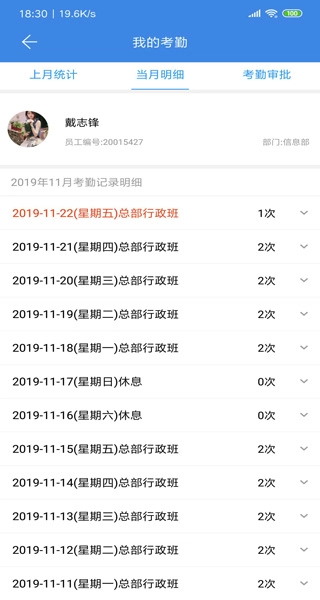 3、考勤数据记录形式多样,涵盖上月、当月、上周等不同时间段的考勤数据信息。