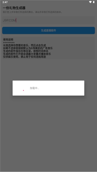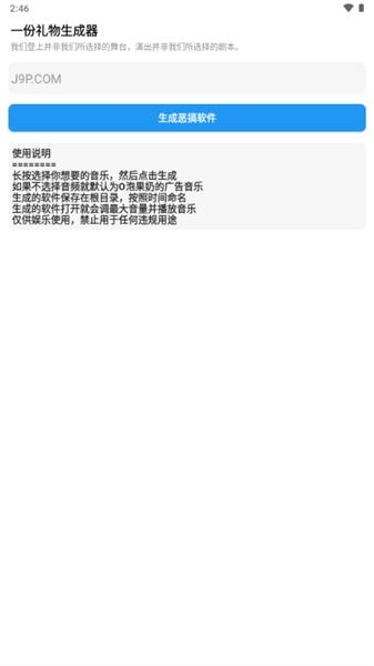 《一份礼物生成器》是一款自带搞笑与恶趣味属性的恶搞软件。在朋友的特殊日子里,把它发给对方,对方的设备就会自动播放“o泡果奶”等各种魔性搞笑音乐。这款软件安全可靠,不会窃取用户信息,也不会被杀毒软件误报,完全可以放心推荐给好友一起开启恶搞模式!这里有丰富的语音素材可供选择,大家能更灵活地整蛊好友,比如让“给我o泡”的音频循环播放,玩起来特别有意思,快来试试吧!