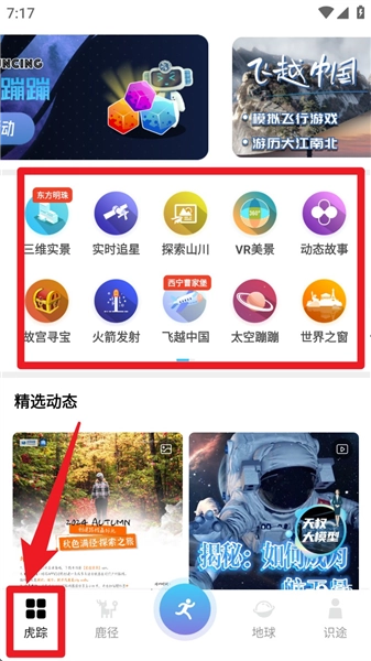 1.进入App首页后,点击底部导航栏中的“虎踪”图标,就能进入实景探索功能的主界面。