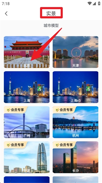 2.在推荐模块里找到“实景”入口并点击,接着选择想要查看的城市模型(例如北京),即可开启浏览。
