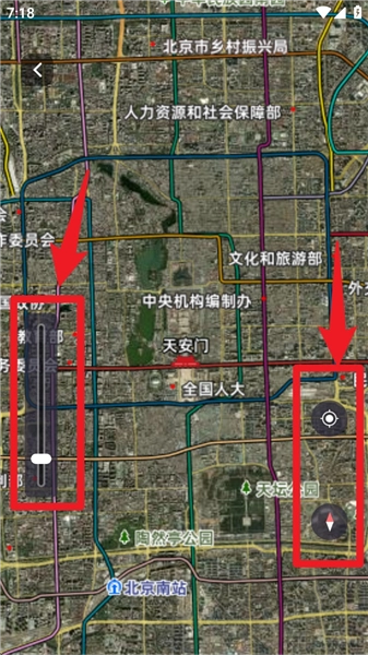 3.进入城市地图界面后,可借助左侧的滑动条对地图进行缩放操作,右侧的按钮则能用于切换视角或快速定位至当前所在位置。