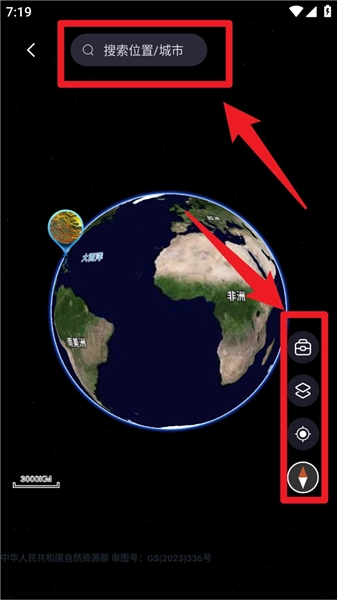 5.若要查看全球地图的完整视图,可点击“地球”图标,借助搜索栏或右侧工具来进行相关操作。