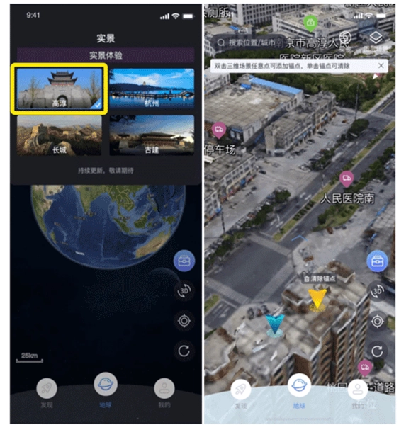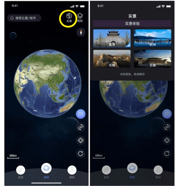 1、在首页点击地球右上角的【实景】按钮,即可进入实景选择页面;