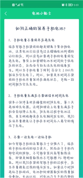 4、软件还为用户提供了电池小贴士,用户可以通过这些小贴士了解如何正确保养电池。