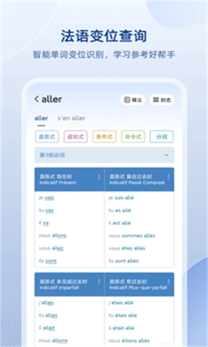 3、提供法语动词变位查询服务,包含18种时态的动词变位反查功能,助力用户更深入地理解和掌握法语动词的运用。