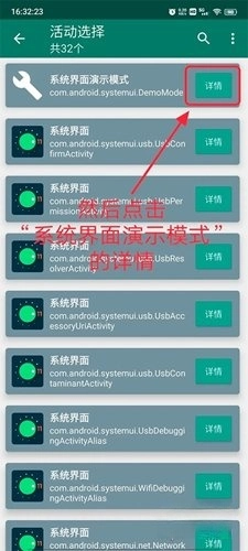 4、在新弹出的界面里,找到“系统界面演示模式”这个选项,然后点击它右侧的【详情】按钮。