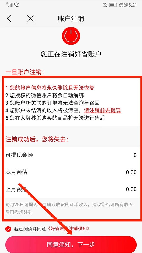 4、勾选同意条款,点击下一步完成注销。