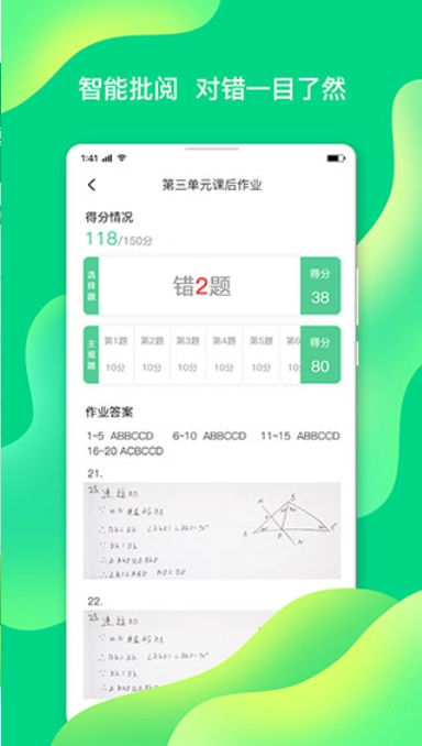 可以智能批改作业,对错清晰明了,既能查看自己的得分详情,也能查看作业答案信息。